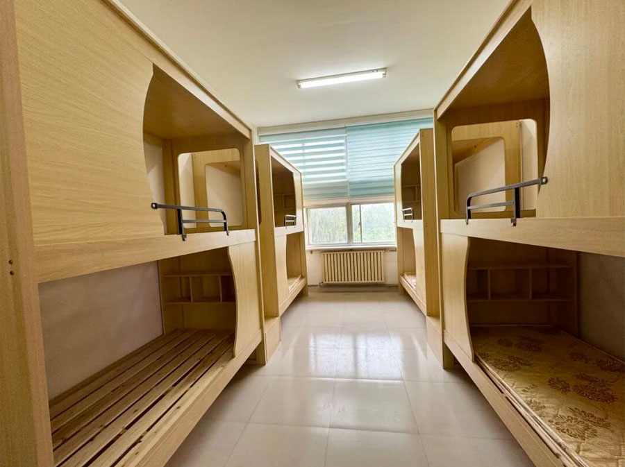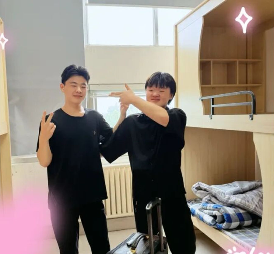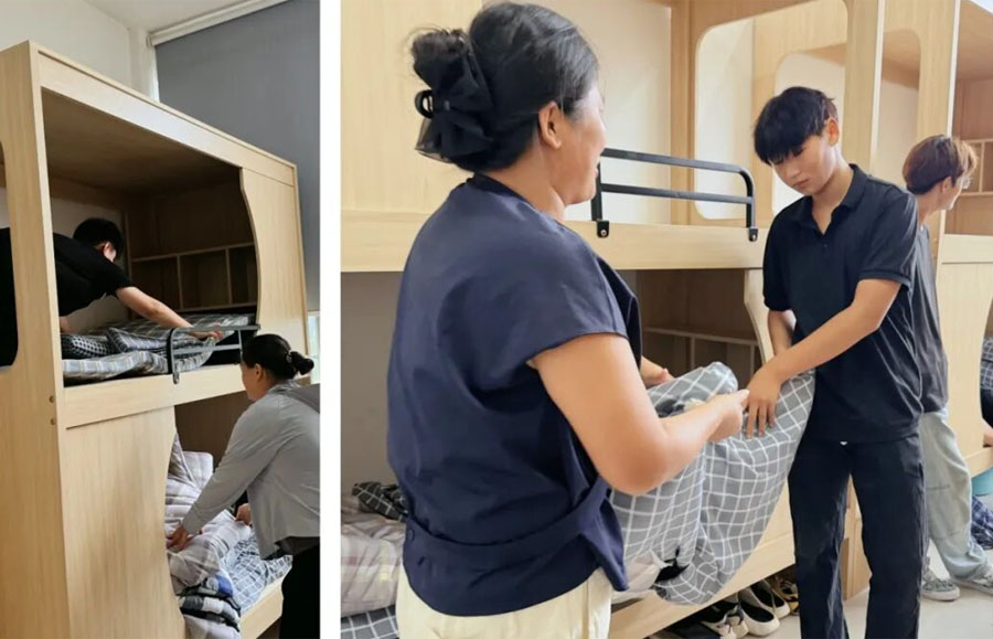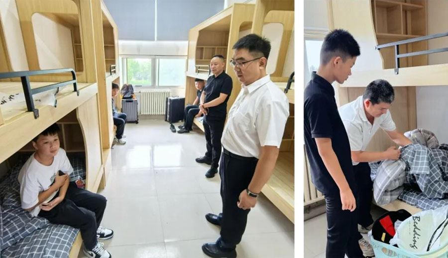 新同学与家长们一起走进明亮温馨的宿舍,铺就属于自己温暖的小窝。